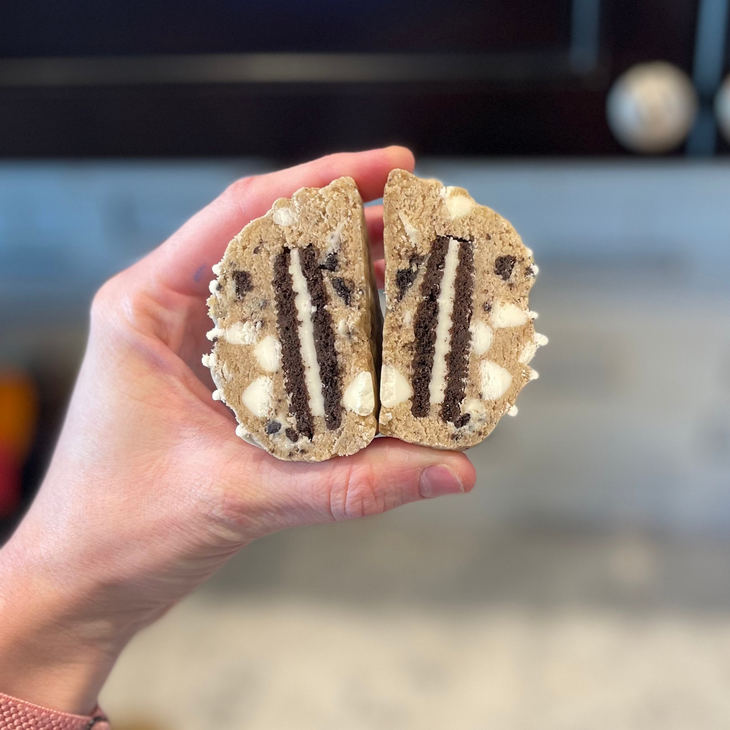 Thick ass STUFFED +3.5oz cookie! Our cookies 'n' cream cookie dough base packed with subtle hints of white chocolate and Oreo flavors. Stuffed with an Oreo in the middle and drizzled with a white chocolate topping.