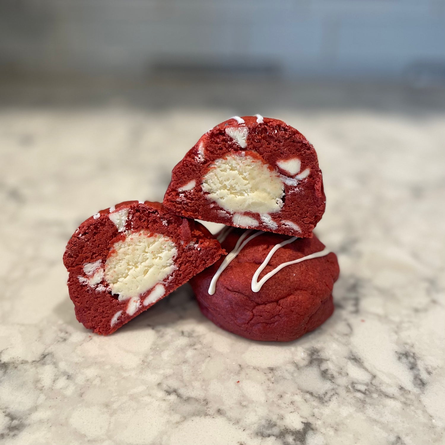 Red Velvet Cream Cheese: A red velvet cookie dough base, with cream cheese chips throughout, stuffed with cream cheese flavored buttercream filling, topped with a white chocolate drizzle.